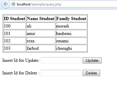 ما چهار صفحه داریم یک صفحه گزارش گیری (با نام query.php ) که علاوه بر گزارش 2 textfield و 2 دکمه داریم یکی برای ویرایش و یکی برای حذف