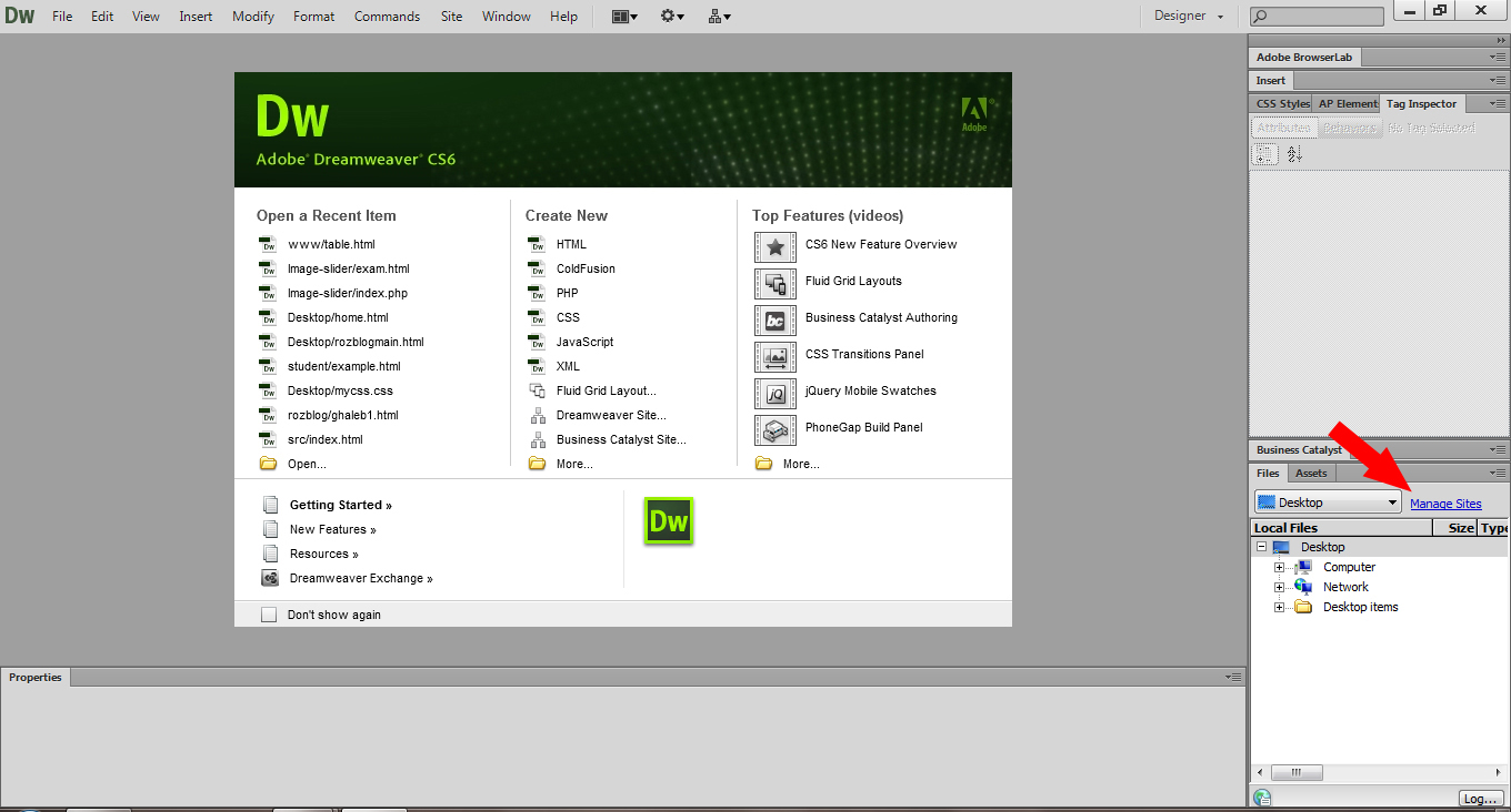 ابتدا نرم افزار Dreamweaver را اجرا کرده در صفحه ابتدایی نرم افزار در قسمت سمت راست گوشه پایین (پنجره Files ) روی گزینه Manage Sites کلیک می کنیم